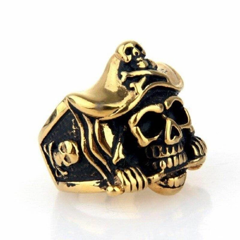 Tu souhaites incarner les pirates les plus cruels de l’histoire ? Tu es au bon endroit ! Voici la bague pirate démoniaque ! Cette sublime bague de couleur or offre de nombreux détails ! On y voit le crâne d’un pirate avec un chapeau qui orne un Jolly Roger ! On y vois une lame entre ses dents ce qui veut dire que rien ne l’arrête, sauf, la mort !