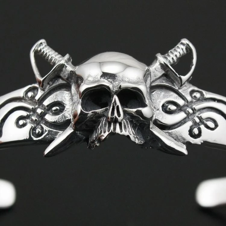 Le bracelet crane pirate pour homme. Ce magnifique bracelet représente le grand drapeau jolly roger tête de mort remplaçant les os, par deux sabres. Le design est simple mais tellement représentatif de la piraterie !