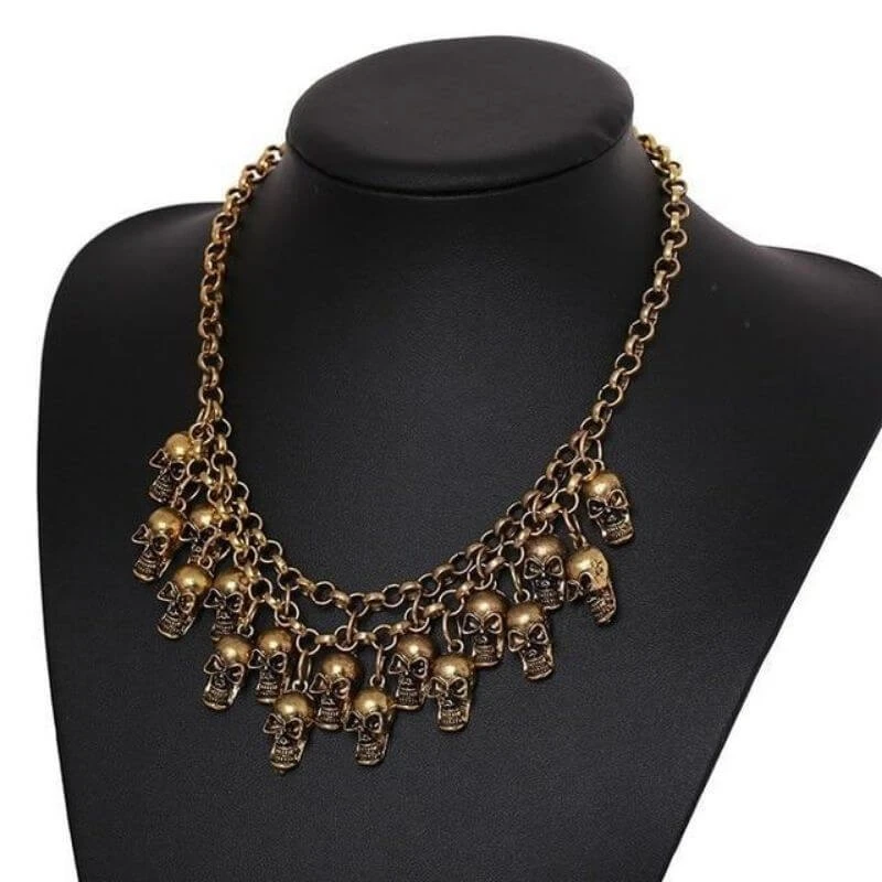 Voici le collier pirate femme tête-de-mort ! Si tu es passionné de piraterie avec une touche de gothique. Tu es au bon endroit ! Ce magnifique collier et super trash comme on aime ! Avec ses nombreuses têtes de mort qui pendent sur le collier, tu auras un style unique et tellement classe !