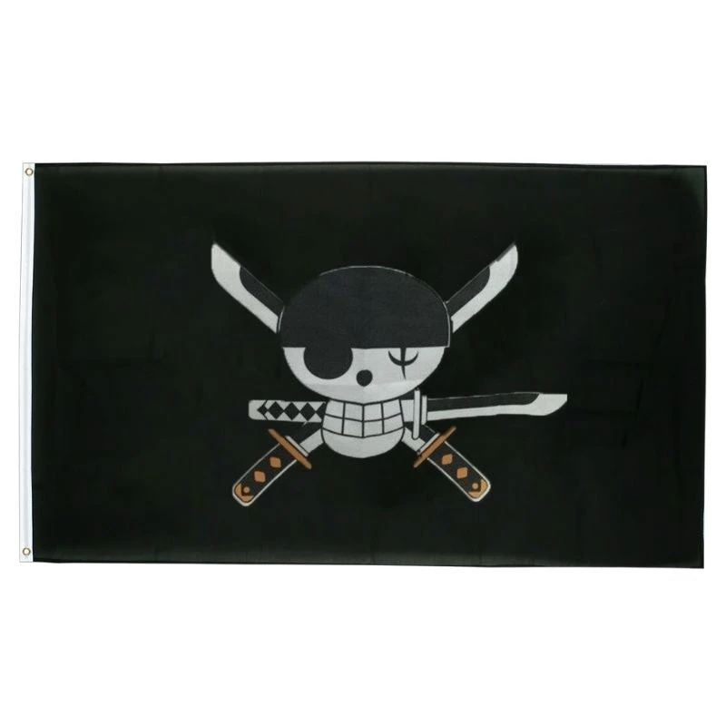 Si tu es fan de One Piece ce drapeau pirate Jolly Roger est parfait pour toi ! On l’appelle aussi le drapeau de Zoro ! On y retrouve les 3 sabres de Zoro en un entre les dents comme quand il se bat ! Bref tu si est passionné de ce mange, il sera parfait pour toi matelot !