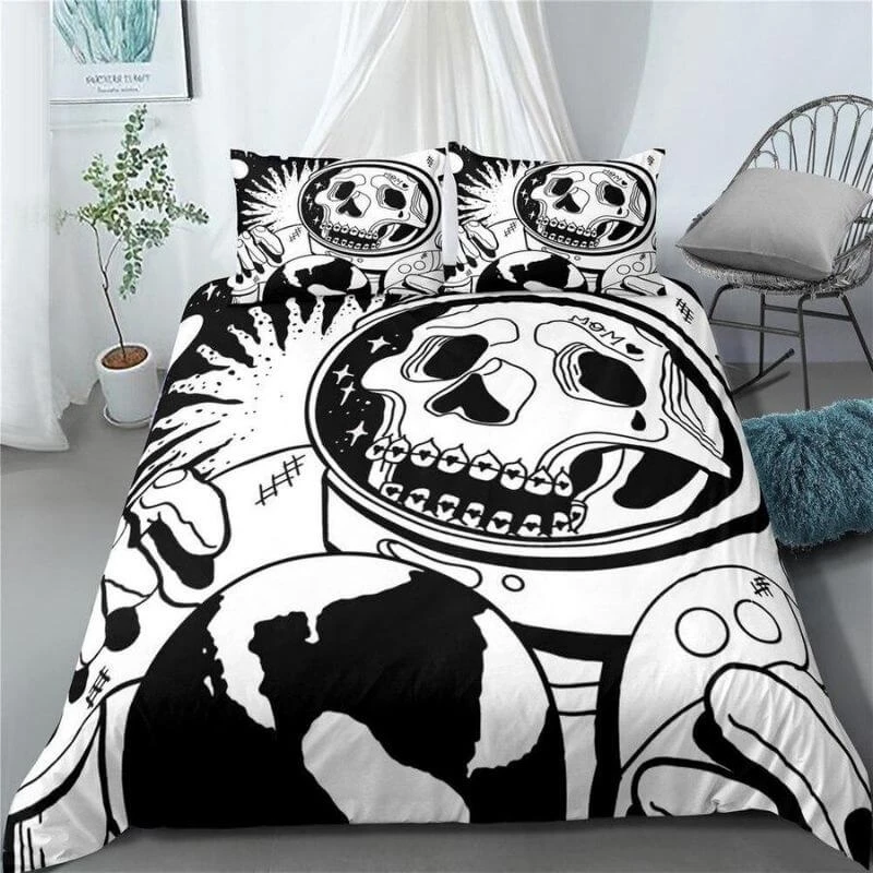 Si tu cherches une housse de couette pirate simple, tu es au bon endroit ! Avec ses deux couleurs donc le noir et le blanc ! Tu pourras dormir dans un lit pirate de l’espace ! Tu incarneras un grand pirate dans ton sommeil matelot ! On y voit la planète est la fameuse grosse tête de mort pirate !